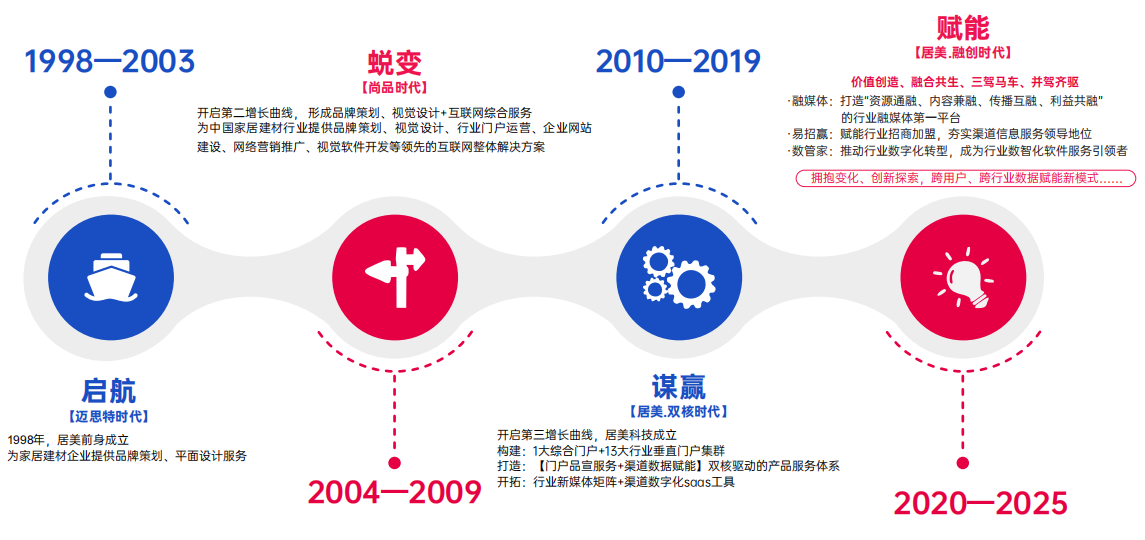 居美科技及前身始于1998年,自成立以來,秉承“賦能家居,價值互聯(lián)”的企業(yè)使命,致力于成為最受信賴的家居渠道服務(wù)企業(yè),為中國家居建材行業(yè)持續(xù)賦能。累計(jì)已為超3200+家居建材企業(yè)提供了精準(zhǔn)招商、品牌傳播、數(shù)字化工具解決方案。